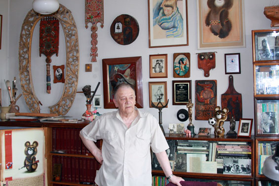 Виктор Чижиков автор Олимпийского Мишки в своей мастерской в Москве на Малой Грузинской. Здесь и создал он легендарный талисман Московской Олимпиады (эскиз его виден в верхнем правом углу фотографии). А в левом нижнем углу плакат из Чехии, который Чижиков редко демонстрирует: олимпийский Мишка с автоматом Калашникова. Эхо Холодной войны: олимпийский Мишка с автоматом Калашникова.